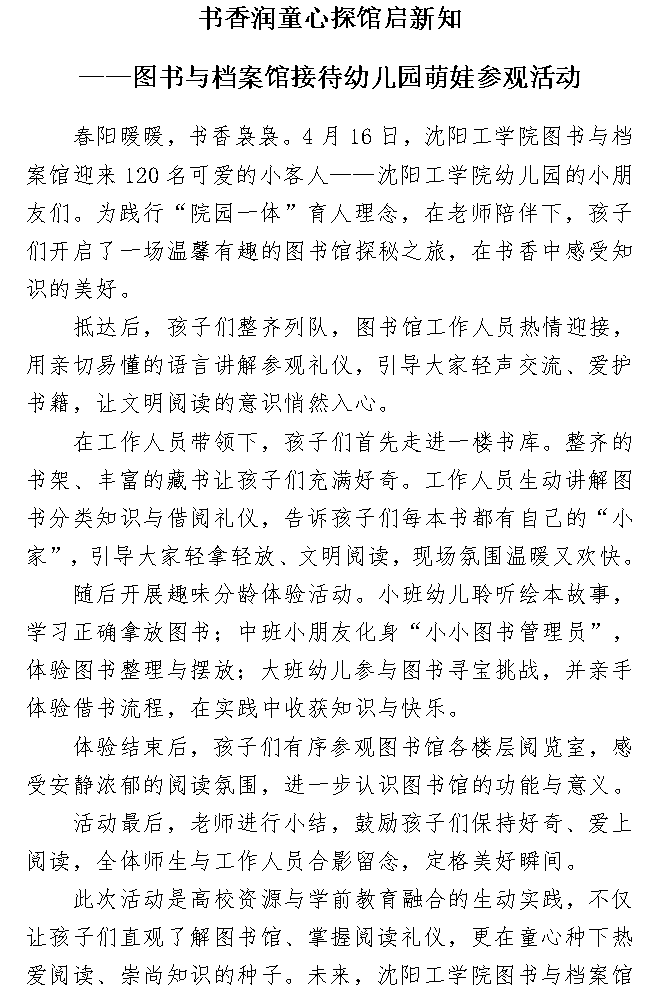 书香润童心 探馆启新知——沈阳工学院图书与档案馆接待幼儿园萌娃参观活动