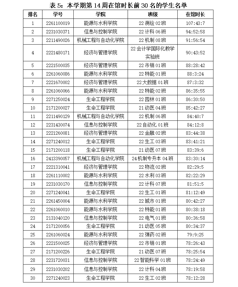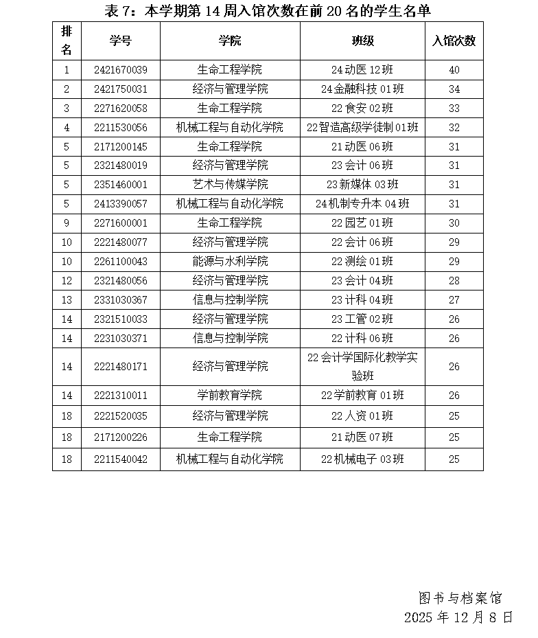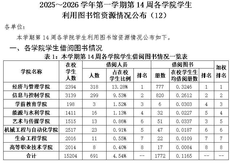 2025-2026学年第一学期第14周各学院学生利用图书馆资源情况公布