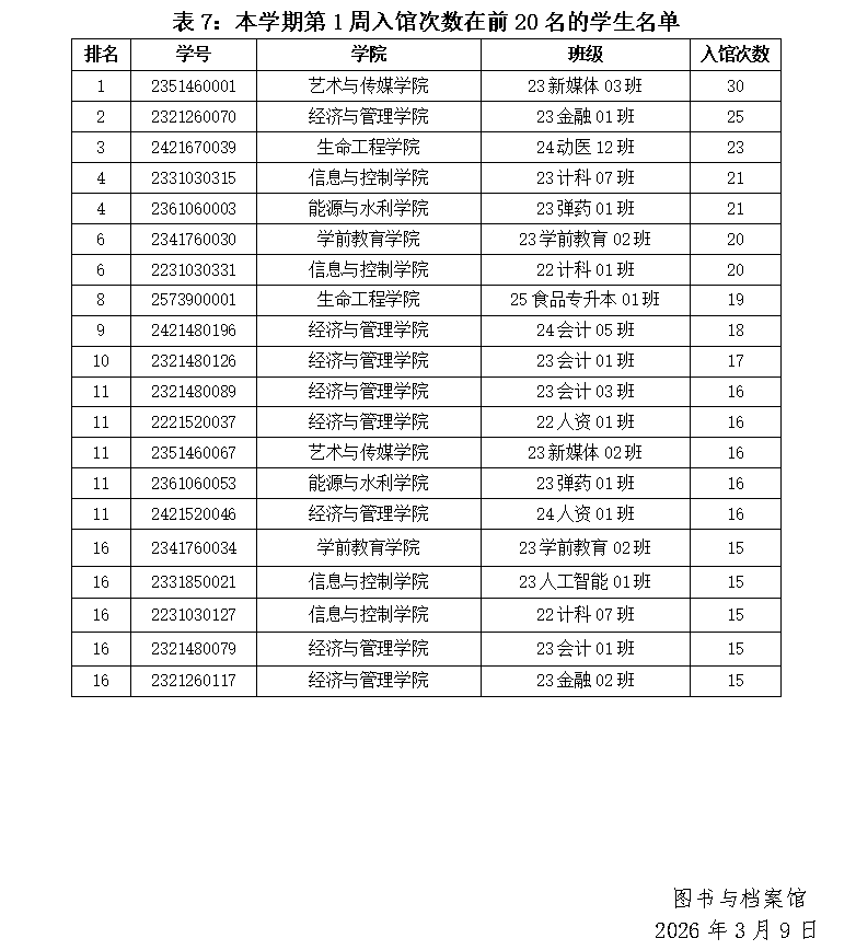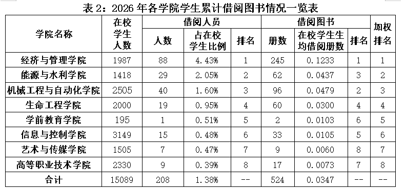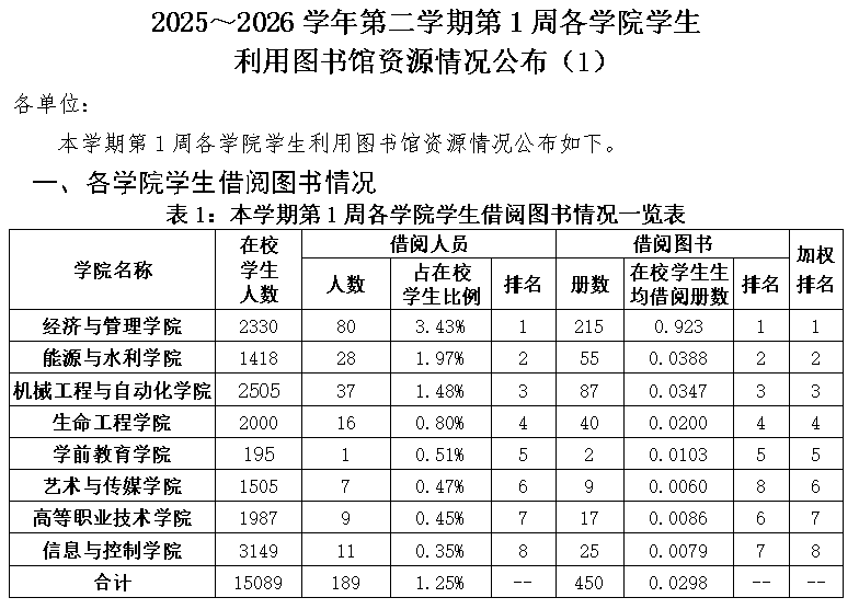 2025-2026学年第二学期第1周各学院学生利用图书馆资源情况公布