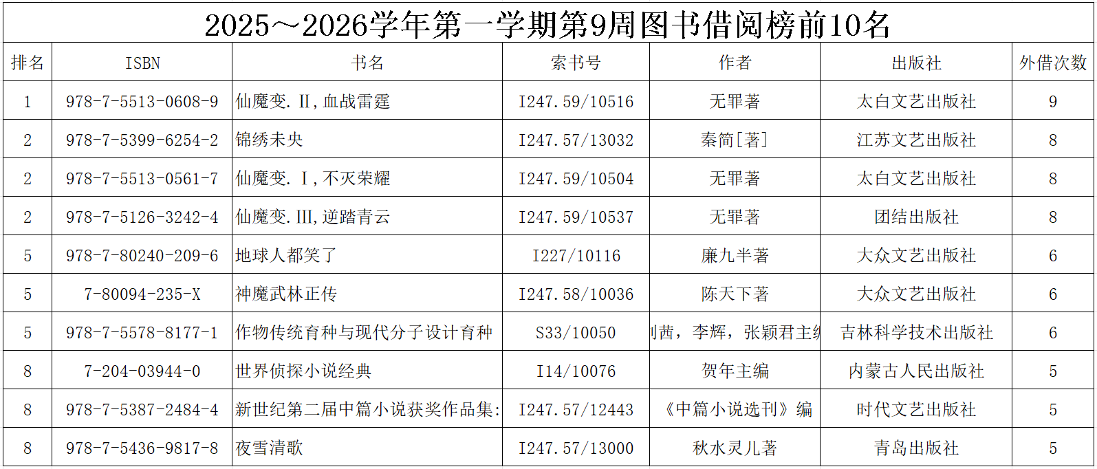 2025~2026学年第一学期第9周图书借阅榜前10名