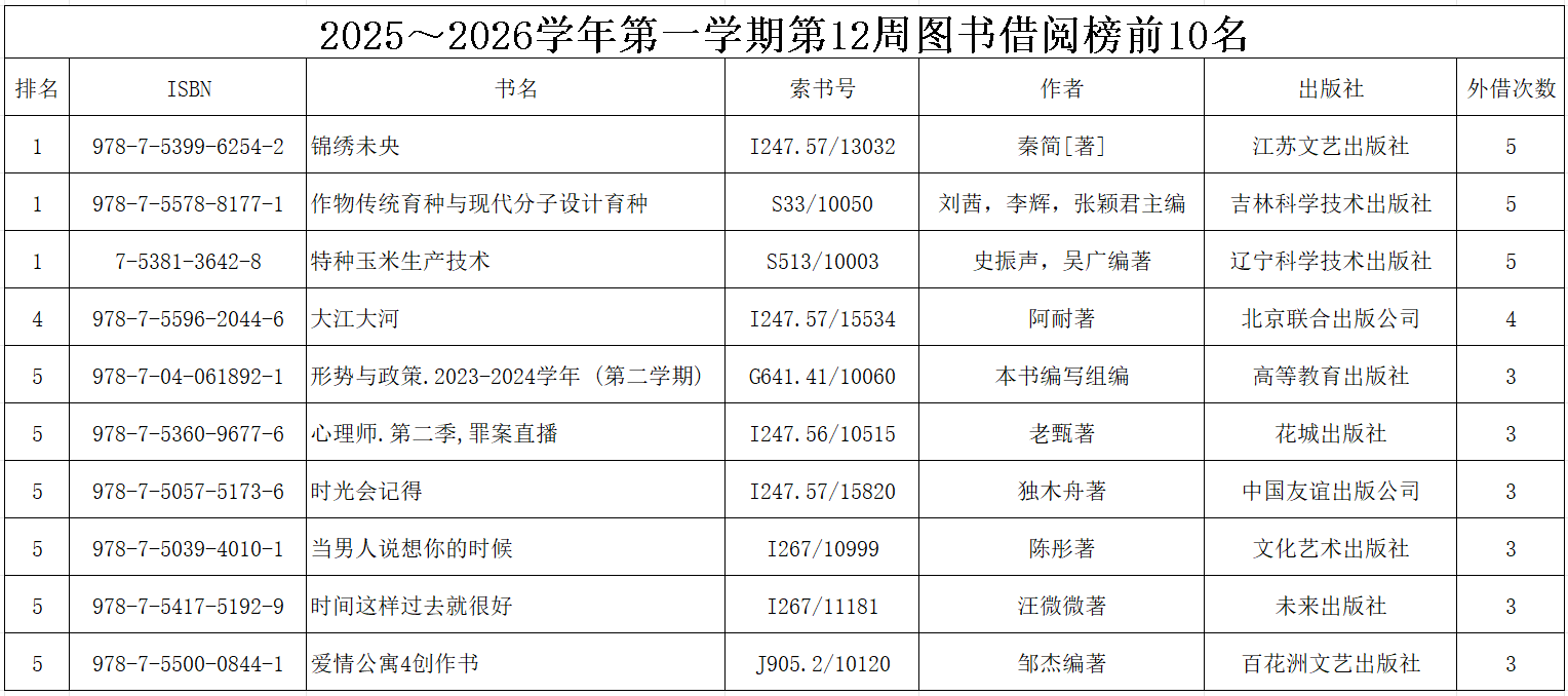 2025~2026学年第一学期第12周图书借阅榜前10名
