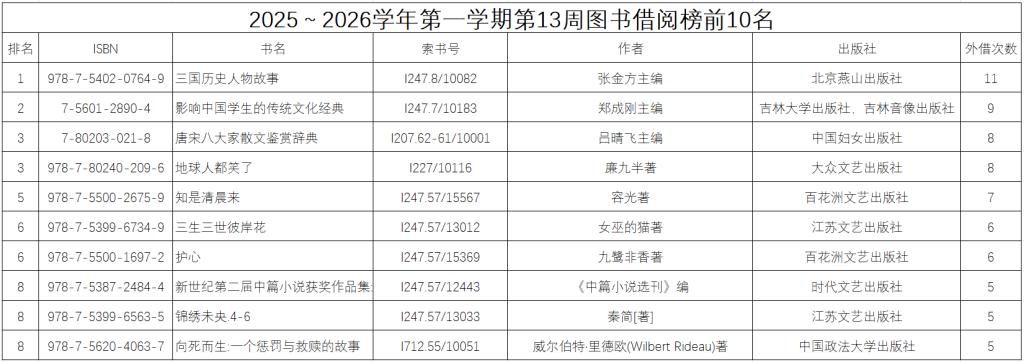 2025~2026学年第一学期第13周图书借阅榜前10名