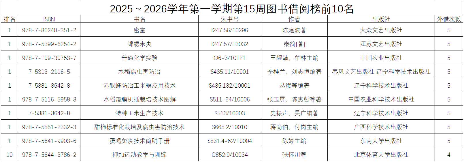 2025~2026学年第一学期第15周图书借阅榜前10名