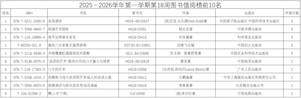 2025~2026学年第一学期第18周图书借阅榜前10名